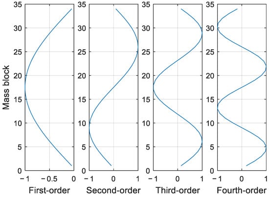 Figure 4 shows the typical modal shape diagram of the axial vibration of a winding with 34 disks by solving the system characteristic Equation (5), where the number of modal vectors is equal to the number of disks. It can be concluded from the figure that the lower the natural frequency, the greater the oscillation period of the disk, that is, the greater the impact on the system. Therefore, only the first four order modal vectors having the greatest impact on the system are taken in Figure 3. The first-order vibration mode shows the windings vibrate in the same direction in the radial direction and is distributed in a “V” shape; the second-order vibration mode shows the windings can be divided into halves from the middle part of the windings in the radial direction, and the upper half and lower half vibrate in the opposite direction, with an “N” distribution; the third-order and fourth-order modes show the higher the number of waves, the higher the distribution of waves in the fourth-order mode.