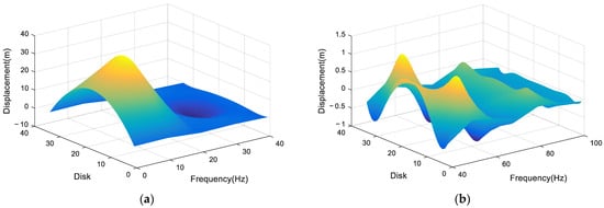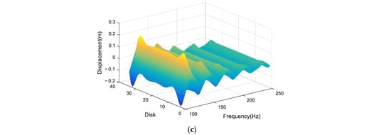 Displacement of each disk at 0–250 Hz. (a) Displacement of each disk at 0–40 Hz; (b) 40–100 Hz; and (c) 100–250 Hz.