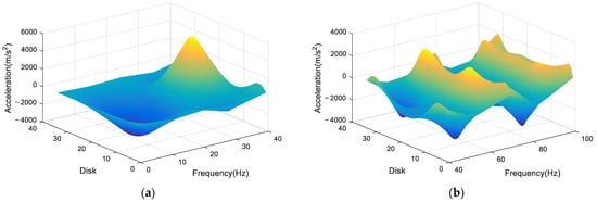 Moreover, all disks have the same acceleration distribution as above. As shown in Figure 6a, at 0–20 Hz, vibration acceleration is distributed in a ‘U’ shape on the winding, consistent with the distribution law of the first vibration mode on the winding. As the frequency increases from 20 Hz to 40 Hz, the displacement shape changes from ‘U’ to ‘double-arch’ and then to ‘M’, consistent with the distribution law from the first-order vibration mode to the third-order vibration mode. Different from the displacement, the peak acceleration in each disk increases gradually with an increase in applied frequency.