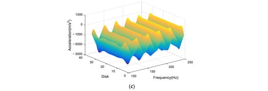 Acceleration of each disk at 0–250 Hz. (a) Acceleration of Each disk at 0–40 Hz; (b) 40–100 Hz; and (c) 100–250 Hz.