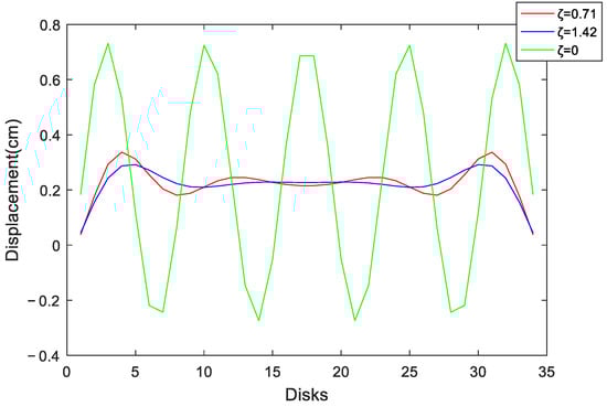 When t = 0.15 s and the damping ratio takes different values, the displacement change at this time is shown in Figure 8. The axial vibration displacement waveform of the winding is in a ‘valley’ shape, which is roughly consistent with the vibration mode law of the eighth order vibration mode, which is just around the frequency of 100 Hz, so it is believed the radial displacement distribution of the winding conforms to the theoretical calculation. The displacement amplitude reaches the peak at one-seventh of both ends, the displacements at the top and the end are close to zero, and the middle disk displacement is distributed in an “M” shape. Therefore, the deformation near both ends of the winding is large, and small in the middle part. As the damping ratio increases, the displacement oscillation amplitude of each disk gradually decreases.