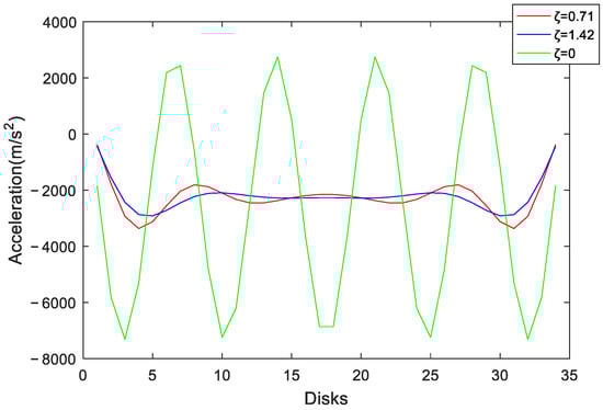 When t = 0.15 s, the acceleration change of each winding disk at this time is shown in Figure 9. Similar to the displacement waveform of each winding disk, the radial vibration acceleration waveform of the winding is in the shape of a ‘valley’, which is also roughly consistent with the vibration mode law of the eighth order mode. The acceleration near both ends of the windings reaches a maximum value, about twice the acceleration of the middle part. With the increase of the damping ratio, the acceleration oscillation amplitude of each disk gradually decreases.