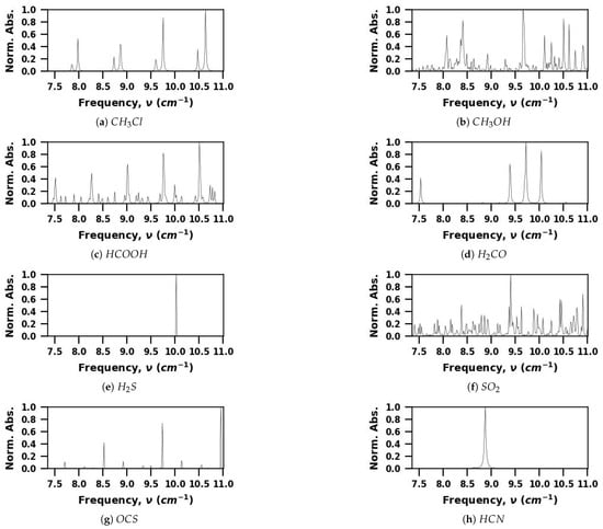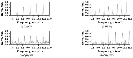 The CNN model developed in this study was trained and validated using spectra for twelve pure VOCs that were simulated using spectroscopic parameters found in the HITRAN [31] and JPL [32] databases. Spectral simulations were carried out using the HAPI tool [33]. Representative simulated spectra for each molecule are shown in Figure 2. The frequency range considered in this study is based on the range available in our THz spectrometer, 220–330 GHz (7.33–11 cm). The dataset consists of spectra for the twelve VOC molecules at pressures from 0.1 to 16.5 Torr (13.3 to 2200 Pa). Each spectra is for a single pure molecule and consists of 229 absorbance values at a frequency resolution of cm.