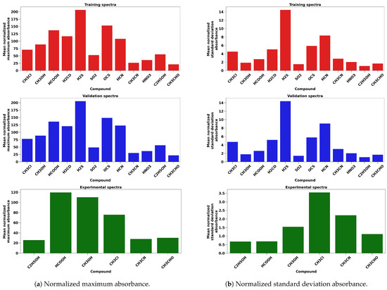 In total, 1968 simulated spectra for twelve VOCs were generated, 70% were used for training (1377 spectra) and 30% were used for validation (591 spectra). The training and validation spectra were chosen using random stratification to ensure all molecules are equally represented in both the training and validation datasets as listed in Table 1. To demonstrate and test the model, 36 experimental spectra for the six VOC molecules were considered. In Figure 3, the number of the spectra in each dataset and their normalized maximum absorbance and normalized standard deviation in absorbance are illustrated to show that there is no bias among molecules in training and validation, and that there is significant variation among absorbance from molecule-to-molecule and from spectrum-to-spectrum for each molecule.