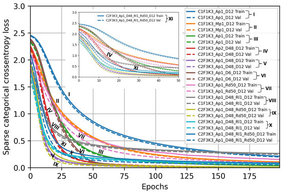 Loss on training and validation data for the considered CNN model architectures.