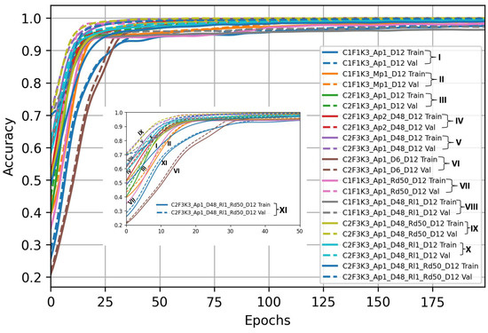 Accuracy on training and validation data for the considered CNN model architectures.