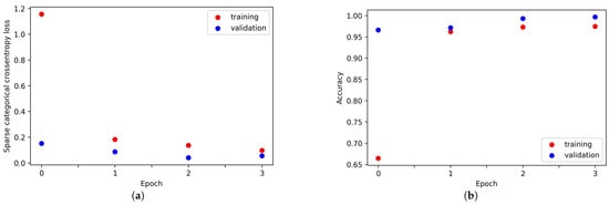 Some of the hyperparameters in the selected CNN architecture were tuned using KerasTuner [40], including the number of filters in the convolutional layers, number of neurons in the dense layer after flattening, and the learning rate. The best epoch for training was found to be four. The final classification model, trained using the optimized hyperparameters, is shown in Figure 1. The sparse categorical crossentropy losses and classification accuracy for training and validation spectra are shown in Figure 6. Using a small epoch helps to prevent overfitting.