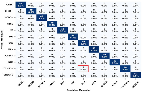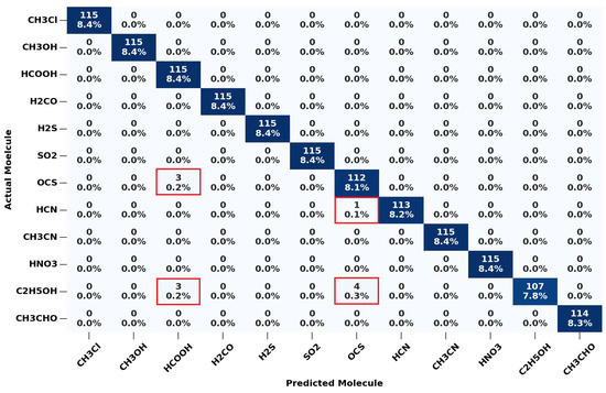 Confusion matrix for the classification of 591 simulated validation spectra. Red boxes indicate misclassifications.