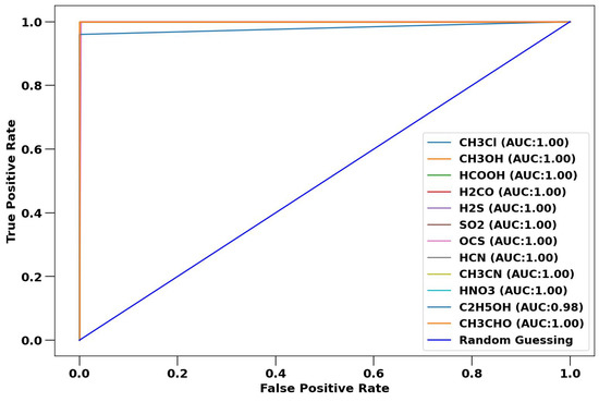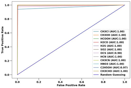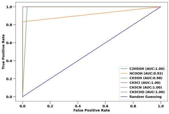 The performance of the VOC-Net classifier was evaluated by consideration of confusion matrices and ROC curves. The confusion matrix and ROC curves for performance against the training spectra are shown in Figure 7 and Figure 8. There are eleven misclassifications for the 1377 training spectra, resulting in a classification accuracy for the training dataset of 99.2%. By minimizing the sparse categorical cross-entropy loss, we have limited training to some extent, which reduces the accuracy against the training dataset. However, this approach results in better generalization for the CNN model and more robust performance in validation and in application against experimental spectra, as illustrated in Figure 6b, where the accuracy on validation data is greater than accuracy on training data, indicating that the generalization error is small compared to the training error. The misclassifications for the training spectra are for carbonyl sulfide, hydrogen cyanide, and ethanol spectra. Interestingly, the ethanol spectra is misclassified as carbonyl sulfide and formic acid. As a consequence, in the ROC curve shown in Figure 8, the ethanol and carbonyl sulfide have reduced area-under-curve (AUC) scores.