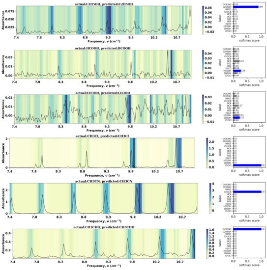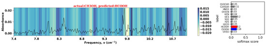 The VOC-Net is further examined using the Grad-CAM method [29], which produces a heatmap superimposed on the raw spectral input to visualize and elucidate the model’s decision making process. The gradients of each target molecule class from the inputs to the last convolutional layer (in our case the second convolution layer) are averaged. Then the gradient multipliers are summed with the corresponding feature maps to generate the heatmap. Localized spectral peaks prioritized by the model for classification are easily visualized and illustrate the molecule-discriminating regions of the spectra. The class activation maps for six experimental spectra correctly classified by VOC-Net are shown in Figure 16. The class activation map for the single misclassification of the methanol spectra at 1 Torr, which VOC-Net incorrectly predicted to be formic acid, is shown in Figure 17. Figure 16 and Figure 17 depicts the softmax scores corresponding to each spectrum next to the class activation maps.