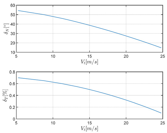 Since the flight path angle is given, the aerodynamic coefficient is approximately a function of the pitch angle, . Once is given, the forward flight speed and descending rate can be calculated with each control input, namely, the thrust and nozzle deflection angle. The results are given in Figure 7.