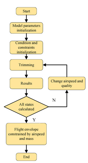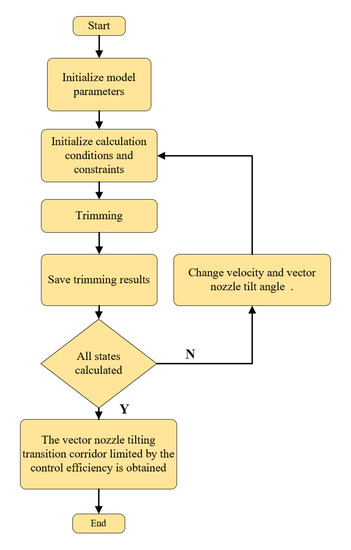 In a complete mission profile, the conversion mode is the process of conversion between the vertical takeoff and landing mode and the fixed wing mode. At this stage, the gravity and drag of the aircraft need to be overcome by the reasonable distribution of the aerodynamic force and power system. However, when flying at a low speed, the required angle of attack may be too large, resulting in a stall. When flying forward at a high speed, it may cause thrust and drag imbalance. Under so many restrictions, the F-35B vehicle can only convert the vertical takeoff and landing mode and fixed wing mode within a certain speed range. This speed range consists of all feasible tilting paths, namely, the tilting transition corridor. The transition corridor is constructed by AES methods. AES is the equilibrium point set that the aircraft can achieve inside the control efficiency boundaries, which is widely used in the controllable boundary establishment of aircrafts. After setting the constraint conditions, the equilibrium boundary can be acquired by trimming the aircraft in all possible states. The calculation procedure is shown below in Figure 10:
