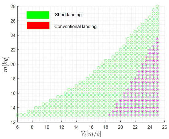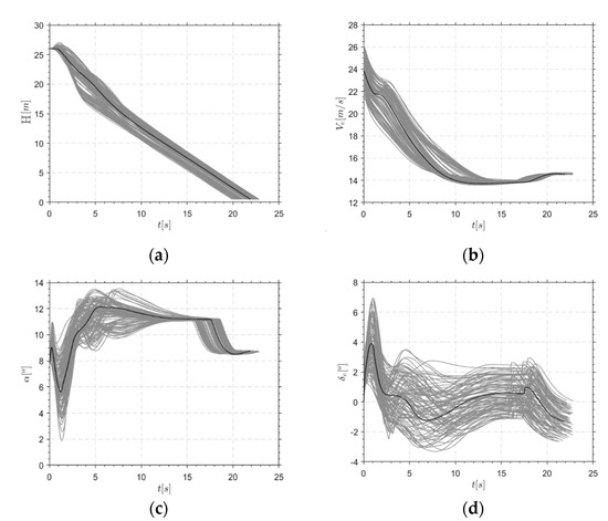 In Figure 24b, the end of the touchdown speed is constrained between 14.18 m/s and 14.69 m/s, which satisfies the requirement that the absolute error should be less than 1 m/s. Figure 24c shows that the angle of attack never exceeded the stall angle of attack of 16°. From Figure 24d, the elevator occupation was less than the limitation of , which means a stability margin still existed in the perturbation states, thus inducing a secure SRVL.