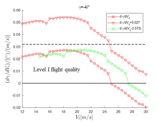 At the SRVL stage, the flight quality specifies some requirements on the trajectory stability. The level-1 flight quality [6,30] requires that the derivatives of the flight path angle versus the airspeed, , should satisfy , and the difference between airspeed at the minimum approaching speed, , and should be less than . can be acquired by Equation (4).