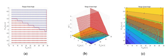 It is revealed in Figure 9b that the feasible zone of flight path angles shrinks with the pitch angle increasing. Specifically, the lower boundaries of the flight path angle are plotted in Figure 9c by the blue lines. Obviously, the lower boundaries decrease from to .