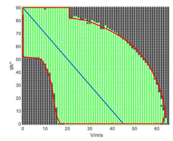 Then, the velocity stability area can be calculated by Equation (6) for each pitch angle. Take the pitch angle of 3 degrees as an example. For a set forward flight airspeed and descending rate, the gliding angle is determined, as are the angle of attack and the aerodynamic coefficients, and . With these parameters, the velocity stability was calculated by the equations deduced above. The results are given in Figure 9a, where the green points are the stable points and the red points are the unstable points. The green points composed the stable region of the flight path angle. The feasible flight path angle was determined for each pitch angle. Piling them together, the flight path feasible zone for the whole flight mission was acquired.