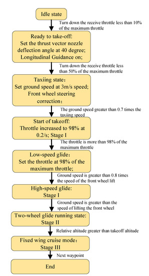 Using the thrust vector can effectively shorten the takeoff distance. When the aircraft takes off, the control of the thrust vector and the lift fan bear part of the lift, which can effectively reduce the takeoff distance. The short takeoff process comprises three stages: (1) from the starting point to the nose wheel lifting; (2) from the lift the nose wheel until the aircraft lifts off the ground; and (3) lifting off the ground to a safe height, as shown in Figure 12.