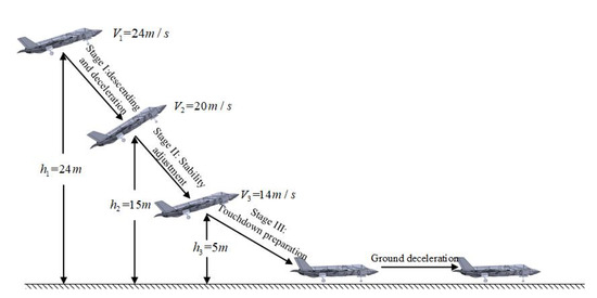 In the military, stealth performance dominates aerial vehicle designs due to the successful practice of the B-2 strategic bombers in the Gulf War. However, stealth is usually achieved at the price of aerodynamic configurations, which inevitably causes poor takeoff/landing performance [1,2,3]. When it comes to shipborne takeoff/landing, this issue becomes somewhat unacceptable due to the limited runway range. A thrust-vectored aircraft is a resolution to this issue, as the propulsion system compensates for aerodynamic loss and enables the aircraft to perform short or vertical takeoffs and landings [4]. The short takeoff (STO) and shipborne rolling vertical landing (SRVL) is a landing strategy proposed for the thrust-vectored aircraft by the US marines. Even though a manned F-35B execution video is published online, the accessible literature on the systematic SRVL approach is limited.