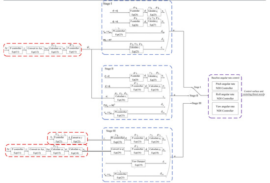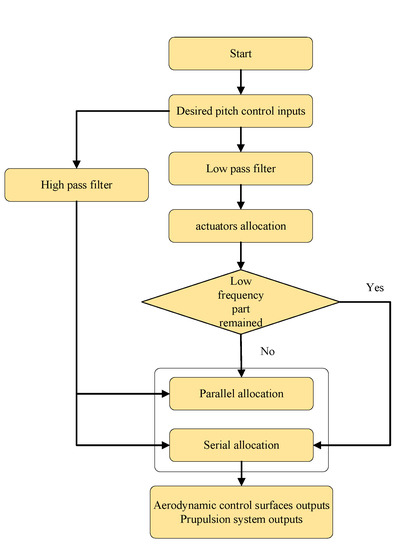 Given that the aerodynamic control surfaces have better reliability, dynamic behavior, and lower energy consumption, the aerodynamic control is prior to the thrust vector control, and the insufficient control efficiency is compensated by the propulsion system. Based on the control efficiency at different dynamic pressures, the virtual control inputs are introduced in the pitch, yaw, and roll channels, combining the aerodynamic actuator commands and the propulsion system commands. This work adopted a frequency-domain-based control efficiency allocation criterion. This method applies a low-pass filter to allocate the low-frequency signals to the aerodynamic control surfaces, and the high-frequency parts are compensated by the propulsion system for attitude adjustment. Then, with the accessible angular acceleration of the actuators and the desired angular rate acceleration, a serial–parallel allocation strategy was designed by the aerodynamic surfaces prior principle, as shown in Figure 20. Therefore, the desired low-frequency angular acceleration treated the aerodynamic control surfaces as the main actuators and the propulsion system as the auxiliary one, which was only activated when the aerodynamic surfaces were saturated. The high-frequency angular acceleration commands were allocated to the remaining aerodynamic control surfaces and the propulsion system based on the control efficiency.
