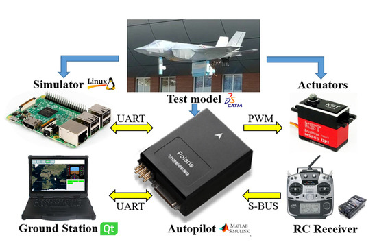 Before testing the algorithms presented in this paper in real flight, more realistic procedures should be implemented to evaluate the performance levels of the algorithms. A hardware-in-the-loop (HIL) simulation was therefore carried out to test and verify in real time the algorithms deployed in the autopilot. The complete HIL architecture is depicted in Figure 21. The architecture comprised two main components, namely, the real-time simulator and the autopilot. The simulator communicated with the autopilot through the full duplex serial link at 400 Hz to receive control instructions, ran the 6-DOF model to calculate the vehicle status (e.g., position, attitude, velocity, etc.), and transmitted sensor data (e.g., inertial measurement unit, GPS, geomagnetism, etc.) to the autopilot. Based on the RC receiver inputs and the sensor information provided by the simulator, the autopilot ran the control program to control the servos and sent back control instructions to the simulator to form a closed loop. In addition, the ground station monitored the flight status in real time. The flight control system was implemented with an approach combining of MATLAB/Simulink and the embedded coder technology to generate the C code for direct deployment. For hardware configuration, the HIL simulation was conducted on the autopilot with a CPU of STM32F765VGT6 216 MHz and the simulator with a CPU of ARM Cortex-A53 1.2 GHz. Furthermore, the controllers ran at 400 Hz with the guidance at 20 Hz.