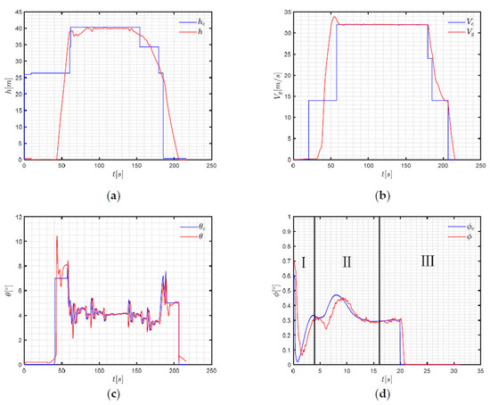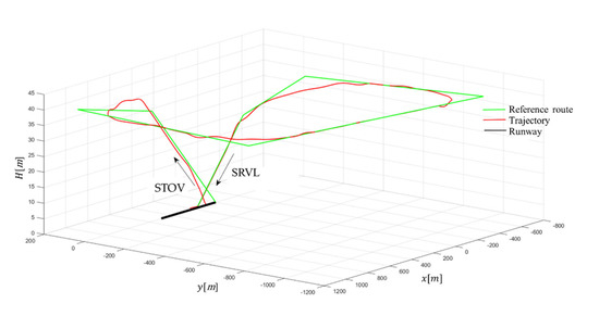 First, the nominal state HIL simulation was executed to provide a benchmark and to verify the feasibility of the proposed STOV and SRVL strategy. The takeoff point of the aircraft was set as the origin and it flew along the reference route. The initial mass of the aircraft was 13 kg, and the servo bandwidth was 20 rad/s.