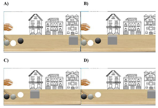 Computer-generated collision events were created using Animate C.C (2016), Adobe Systems. Participants watched dynamic collision events on a 34 cm Macbook full screen and were seated 10 cm away from the screen. The backdrop consisted of an image of a wooden table (W = 21 cm, H = 5 cm), background of three houses (W = 14 cm, H = 6 cm), a ramp (W = 4 cm, H = 4 cm), a cube (W = 3 cm, H = 3 cm), a hand (W = 3 cm, H = 2 cm), a white/bright ball (H = 2 cm, W = 2 cm), and a black/dark ball (H = 2 cm, W = 2 cm).