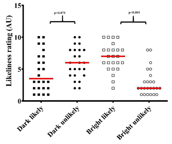 All data were analysed using Jamovi version 2.0 (The Jamovi Project). Data were tested for normal distribution by Shapiro–Wilk’s test and for homogeneity of variance using Levene’s test. Our data violated the normality and parametricity assumptions, thus we performed a Friedman’s Test to examine for differences in ratings between bright likely, bright unlikely, dark likely and dark unlikely collision outcomes. Subsequently, pairwise comparisons (Durbin-Conover) were performed to locate differences. We report alpha levels as exact p values, without dichotomous interpretation of ‘significant’ or ‘non-significant’ as advised by the American Statistical Association [26]. Effect sizes are reported using Kendall’s W for Friedman’s Tests and rank biserial correlations (r) for pairwise comparisons. Both measures of effect are interpreted using Cohen’s guidelines (0.1− < 0.03 small, 0.3− < 0.5 moderate, and ≥ large [27]. Figures were generated in GraphPad Prism (GraphPad Prism 8.4.3, GraphPad Software Inc, San Diego, CA, USA) and display grouped dot plots as recommended by Drummond and Vowler [28] and Weissgerber et al. [29]. Parametric data are summarised in text as mean ± SD and non-parametric data as median [interquartile range (IQR)]