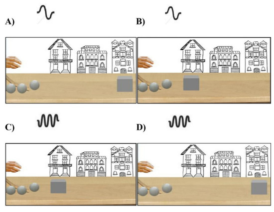 Animations were the same as in Experiment 1, except that the balls were the same colour (grey; Figure 3). Additionally, a 0.3 s sound during the collision was pitched high or low for the test events. The low-pitch sound had an acoustic amplitude of 50–56 dB (range) and an auditory frequency of 29–633 Hz (range). The impact sound (i.e., when the ball hit the cube) was 633 Hz and 56 dB. The high-pitch sound had an acoustic amplitude of 50–60 dB (range) and an auditory frequency of 43–1011 Hz (range). The impact sound (i.e., when the ball hit the cube) was 1011 Hz and 60 dB. The amplitudes of low pitch and high pitch collision sounds were adjusted until they were perceived equal by a pilot sample (N = 5). The final dB used for the high and low pitch collision sounds were the average dB suggested by the pilot sample.