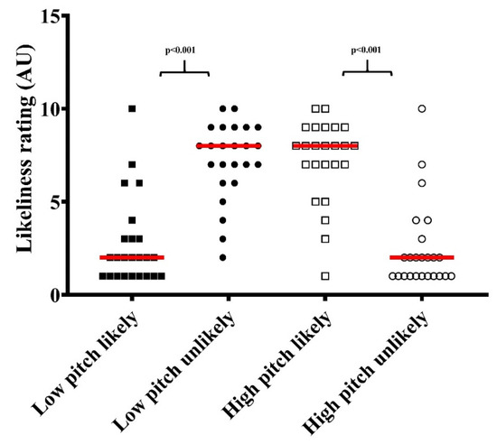 Real-life based likeliness ratings of high and low pitch likely and unlikely test events. Data are presented as grouped dot plots and medians. AU = arbitrary units.