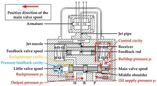 The pressure servo valve model consists of three parts: the jet amplifier model, the feedback valve spool model, and the main valve spool model.