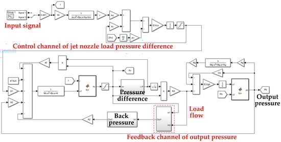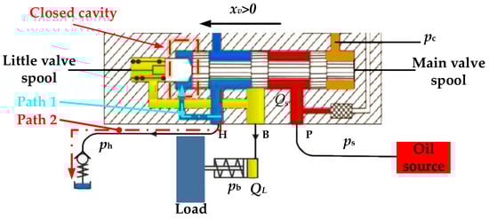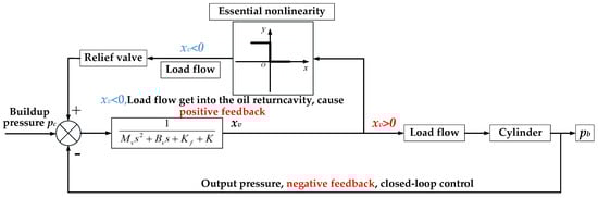 The sudden change of backpressure will cause the resultant force (along the negative direction, xv < 0) which acts on the main valve spool increases furtherly. In addition, the positive feedback will form to force the main valve spool to move to the right side, until the output pressure drops more to form a new force balance state. This process can be represented by the control block diagram shown in the Figure 12.