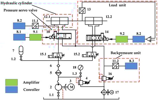 The output pressure pb can be measured by the pressure sensor 11.1. The load unit is used to simulate the dynamic load of the hydraulic cylinder. The backpressure unit consists of a pressure sensor and a relief valve.