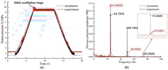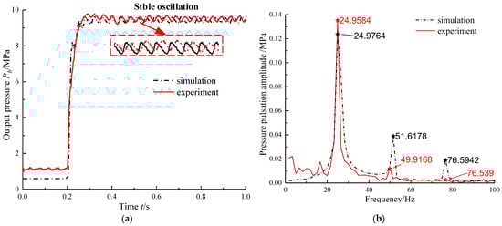 Under the action of step signaling, the output pressure oscillates stably with constant amplitude, and its peak-to-peak value is about 0.40 MPa. Under the condition of a frequency range of 0~100 Hz and a sampling frequency of 60 Hz, the FFT spectrum of stable oscillation pressure can be obtained as shown in Figure 8b. It can be seen that the main frequency of pressure oscillation is about 25 Hz.