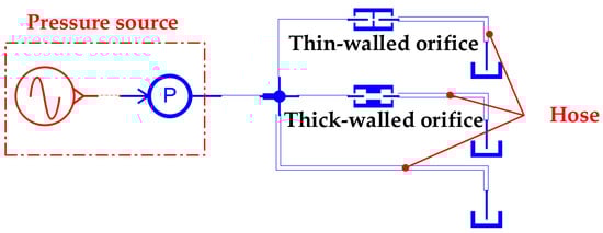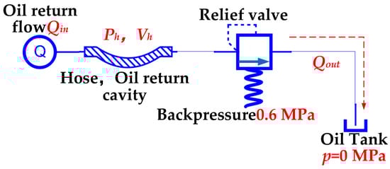 The pressure servo valve inevitably overshoots its output pressure under the action of step signaling. The overshoot pressure (which is higher than expected output pressure) will disrupt the dynamic force balance of the main spool, and the main valve spool will generating negative displacement (xv < 0). At this time, port B in Figure 10 will connect to port H. Additionally, due to the differential pressure, the oil that comes from the cylinder will flow into the oil return cavity through the power stage spool window. This oil will be divided into two paths. The oil that goes along path 1 will enter the closed cavity (which is shown in Figure 10), causing a sudden pressure increase in the cavity. The oil that goes along path 2 will enter the oil return cavity (formed by the hose between the pressure servo valve and relief valve), causing a sudden pressure increase in said cavity. To further illustrate the pressure dynamics in the oil return cavity, a model is built, as shown in Figure 11.