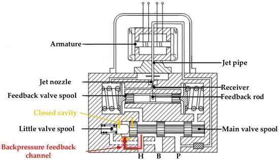A pressure servo valve is a special jet pipe hydraulic servo valve, which can realize the feedback control of output pressure through the internal flow channel. Therefore, a control system using the pressure servo valve can realize the accurate control of output pressure in open-loop condition (without pressure sensor). Pressure servo valves are widely used in aircraft wheel braking systems with the advantage of easy control and high reliability. As a key component of large aircraft wheel brake servo control system, the pressure servo valve plays a very significant role in bearing impulse load and providing braking force [1,2]. However, the feedback structure inside the pressure servo valve can also cause positive feedback, which can lead to the nonlinear self-excited oscillation of aircraft wheel braking system and cause serious safety accidents [3].
