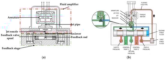 In this paper, the pressure servo valve pre-stage includes two parts: jet amplifier and feedback stage, where the structure is shown in Figure 24a. Its working principle is similar to that of the force feedback two-stage hydraulic servo valve, as shown in Figure 24b.