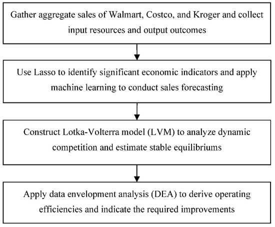 Figure 1 details the proposed techniques. First, Lasso (least absolute shrinkage and selection operator) is adopted to identify key predictors that significantly affect the sales revenues of Walmart, Costco, and Kroger. Then, machine learning is applied to conduct sales forecasting. Second, the LVM (Lotka–Volterra model) is used to analyze market dynamics between the three retailers and estimate their stable equilibriums. Lastly, DEA (data envelopment analysis) is applied to derive operational efficiencies and indicate necessary actions for the improvement of inefficient firms. Without loss of generality, MARS (multivariate adaptive regression splines), SVR (support vector regression), and DNN (deep neural network) are adopted in sales forecasting.