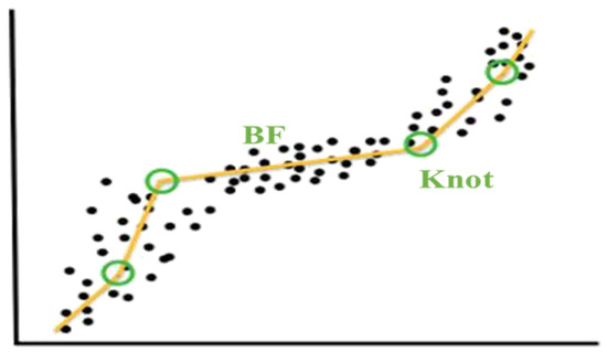 where is a constant, are regression coefficients of the model, M is the number of basis functions (degree of nonlinearity), is the number of splits for the mth basis, takes values of either 1 or −1 to indicate the right or the left step function, are input variables, and are “knot” locations in each interval [40]. In Figure 2, a nonlinear mapping is approximated by using “knots,” in which BF means basis functions.