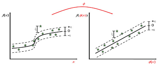 Based on quadratic programming [41,42], Figure 3 shows how support vector regression (SVR) transforms the low-dimensional input space to the high-dimensional feature space using a linear cylindrical tube:
