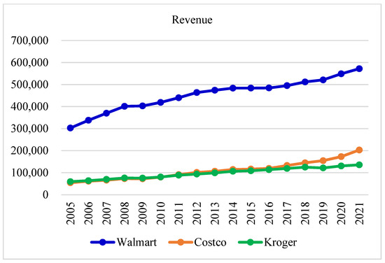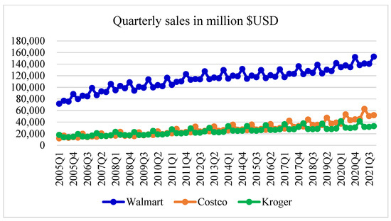 Needless to say, this research is not without limitations: (1) due to limited information, only aggregate sales were collected and analyzed for Walmart, Costco, and Kroger. Product sales with respect to detailed categories (perishable food, home supplies, electronic appliances, snacks, etc.) could provide more insights [4]; (2) only onsite retailers with branch stores were analyzed and compared, while the competition arising from online e-commerce platforms, such as Amazon, were omitted. Moving forward, the boundary between onsite stores and online platforms is expected to blur, and hence, their competition deserves to be addressed [2,31]; and (3) the STP issue, market segmentation, customer targeting, and product positioning should be considered in order to fit consumer preferences for the accomplishment of upselling and cross selling. Furthermore, purchasing transaction records should be linked to customer demographics to develop attractive product strategies and promotion plans.