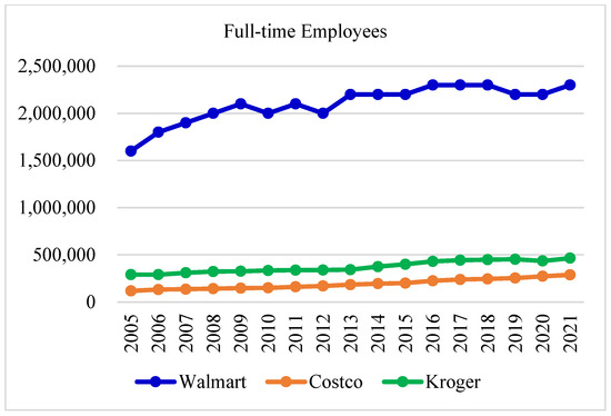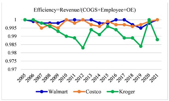 To help Kroger improve operational efficiencies, Table 10 shows the required adjustments of input resources in percentages. In 2005, no adjustments were required for any retailer. As shown in Figure 6, Kroger performed the worst from 2008 to 2019, and hence, it needed to concurrently reduce COGS, full-time employees, and operating expenses during these years. In 2010, 2012, and 2021, Costco and Walmart performed efficiently, and thus, no adjustments were required. Further, the reduction of COGS and operating expenses was more critical to Costco and Kroger, while Walmart seemed to focus on decreasing full-time employees. Although Walmart had the greatest scales of input resources and out revenues, it performed efficiently in many years: 2005, 2010, 2011, 2012, 2013, 2016, 2017, and 2021. In 2018, Walmart spent a lot of money to merge an e-commerce platform because it wanted to defend its territory and compete with Amazon. This event, coupled with the US–China trade war, can explain Walmart’s inefficiencies in 2018 and 2019. On average, Costco did not perform as well as Walmart but it was still more efficient than Kroger. In practice, to enhance operational efficiencies, cost reduction is easier than increasing sales revenues.