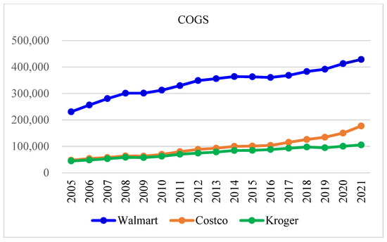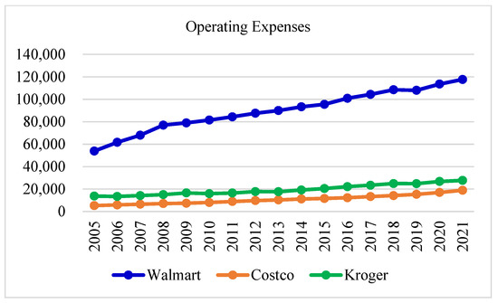 To conduct performance assessment, the correlation coefficients between input variables (COGS- cost of goods sold, full-time employees, OE- operating expenses) and the output variable (sales revenue) are shown in Table 8. Positive coefficients imply that the output is proportional to the input, thus justifying the validity of the input and output variables. In terms of BCC measures, the operational efficiencies for Walmart, Costco, and Kroger are shown in Figure 6. Clearly, Kroger has significantly lagged behind Walmart and Costco since 2009. To address hidden causalities, all input and output variables are displayed in Figure 7, Figure 8, Figure 9 and Figure 10. Not surprisingly, Walmart exhibits the largest scales of input and output variables. Kroger shows almost equivalent sales (Figure 7) and COGS (Figure 8) to Costco, though it has more full-time employees (Figure 9) and higher operating expenses (Figure 10) than Costco. These observations clearly account for Kroger’s operational efficiency ranking being the lowest, because it consumes more input resources without generating higher sales revenues. Although Walmart expresses worry about Amazon’s move to retail markets, Kroger can potentially be more impacted by Amazon because it is a chain supermarket with community-based stores. To elicit more insights, partial operational efficiencies with respect to a single input variable are derived and shown in Table 9: Costco performs poorly in “COGS” and Kroger performs the worst in both “full-time employees” and “operating expenses”.