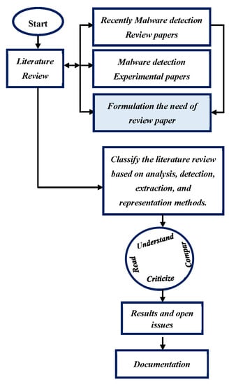 We followed the methodology which is shown in Figure 2 to introduce this paper. Firstly, we focused on the review papers that have been written recently to identify the limitations of the existing reviews and then show the need for new literature review papers. Secondly, in addition to the review papers, we used specific key words to collect the relevant experimental papers. Thirdly, according to the analysis and the detection approaches along with the extraction and the representation methods that have been utilized in each single study, the literature review is classified. Four processes, which are reading, understanding, comparing, and criticizing, have been conducted in the last phase to obtain the final results of this survey and highlight the future directions and open issues in the malware detection and classification area. Figure 2 shows the methodology that is followed to write this survey.
