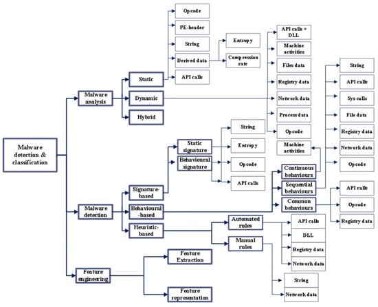 Furthermore, the family’s analysis, similarities analysis, and variants analysis were determined as analysis strategies. Different selection and detection techniques were explored to explain how they affect the malware detection model’s performance. Subsequently, the impact of the feature types and the classification techniques have been investigated to prove that there is no one approach capable of detecting all the malware types. The author of [24] presented a complete overview of modern methods and strategies for the feature selection phase based on the data perspective. Therefore, they divided the feature selection methods into theoretical, spare learning, and statistical approaches based on similarity.