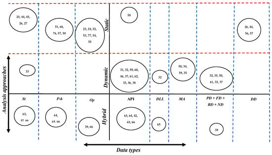 The most used data types with each analysis approach have been shown in Figure 4. On the x-axis, the data types are depicted as string (St), PE-header (P-h), Opcode (Op), API calls (API), Dynamic link library (DLL), machine activities (MA), process data (PD), file data (FD), registry data (RD), network data (ND), and derived data (DD). Similarly, static, dynamic, and hybrid are mapped on the y-axis as analysis approaches. The horizontal and vertical dotted lines illustrate the relationship between each data type and each analysis approach by showing how frequently each single data type has been used with each particular analysis approach in the literature review.