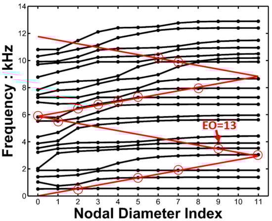 - When , the excitation component with excitation order 13 and circumferential wave number 9 will excite the modal resonance with nodal diameter ;