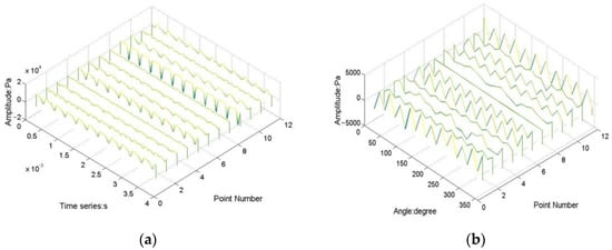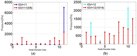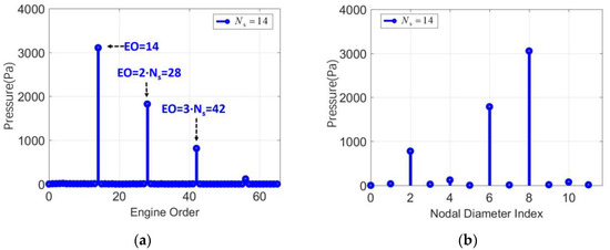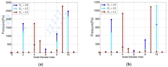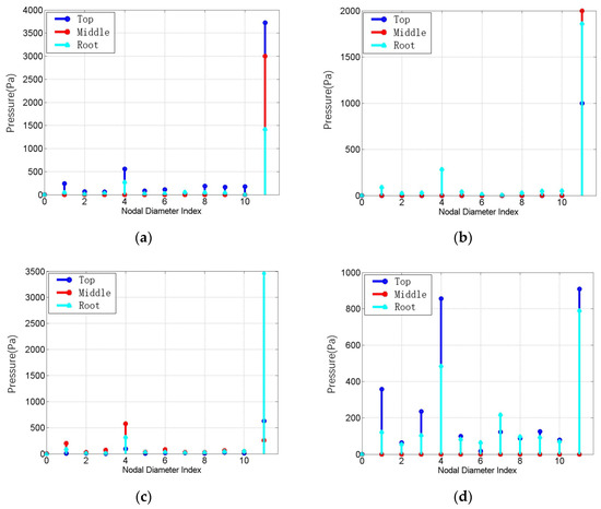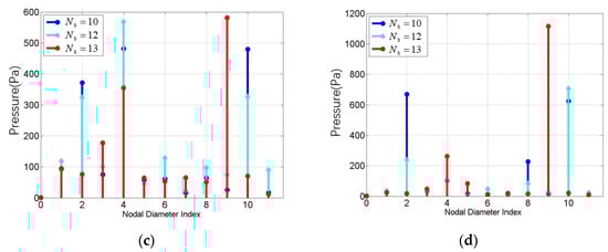 - The excitation components of rotor–stator interference flow field on a bladed disk can be described by frequency components and circumferential wave components. The main frequency components can be written as , whereas the main circumferential wave components can be written as , among which . Components corresponding to are the main excitation, both for frequency and circumferential wave components, and the amplitude decreases with the increase in .