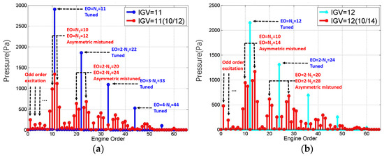 - Compared with tuned stators, mistuned stators break up the wake energy by changing the topology of the blade. Therefore, the maximum amplitude of the wake excitation component decreases; however, the number of excitation components increases.