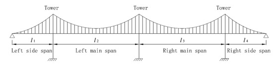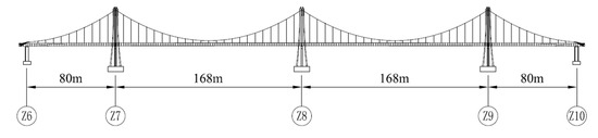The Luozhou Bridge in Fuzhou, China, is a self-anchored suspension bridge with three towers and four spans. The span layout is 80 m + 168 m + 168 m + 80 m, as shown in Figure 5. Main design parameters: the rise-span ratio of main span is 1/6, the height of the main tower is 48.9 m, the elastic modulus of stiffening beam is 2.06 × 105 MPa, the elastic modulus of main cable is 1.95 × 105 MPa, the longitudinal stiffness of main tower (single tower) is 50 MN/m, the vertical bending moment of stiffening beam is 1.690 m4 and the cross-sectional area of stiffening beam is 1.501 m2.