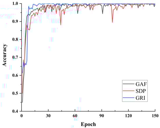 At present, the methods of converting vibration signals into images mainly include the Symmetry Dot Pattern (SDP) method, Gramian Angular Field (GAF) method and Grayscale image (GRI) method [,,,]. The following uses the bearing public data set from Case Western Reserve University (CWRU) to verify the validity of the above three vibration signal imaging methods applied to state recognition, and to determine the method used in this paper.